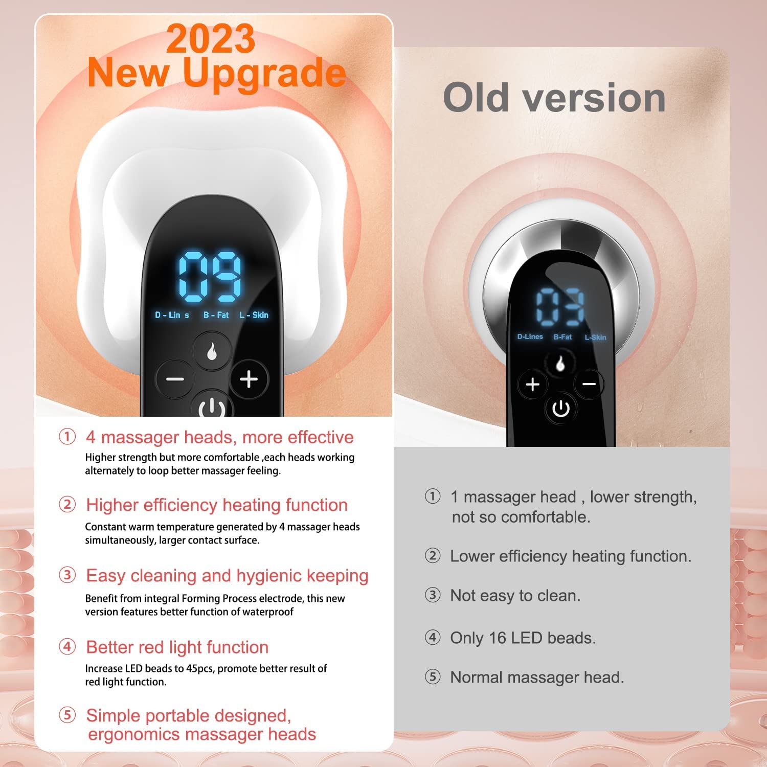 · Ultimate version: base on feedback about more than one hundred thousand clients using experience, we add to 4 massager heads and test out the best working strength, launched market this cool cellulite machine for home, 4 heads provide larger contact surface to work.